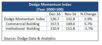 The Dodge Momentum Index increased 2.9 percent in December to a reading of 136.7. The index is at an eight year high although more than 25 percent below its peak in 2007.