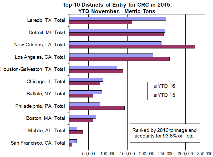The chart shows graphically the tonnage of CRC that entered the top 10 districts in YTD November for 2015 and 2016 and is ranked by 2016 tonnage. These 10 districts account for 93.8 percent of the grand total in the first 11 months of 2016. Laredo has received the most tonnage in 2016 and is up by 53.8 percent YTD. New Orleans and Philadelphia were down by 26.8 percent and 44.0 percent respectively through November.