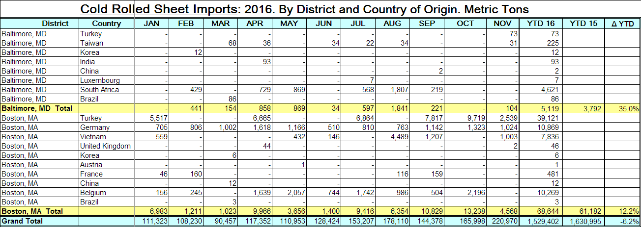 The table included here (click to enlarge) is a small extract from the data sheet for CRC coil. It describes the tonnage that has come in through Baltimore and Boston and the grand total. It shows where it came from, the YTD tonnage and the YTD change compared to 2015. The grand total volume of CRC through November was down by 6.2 percent but Baltimore was up by 35 percent and Boston up by 12.2 percent.