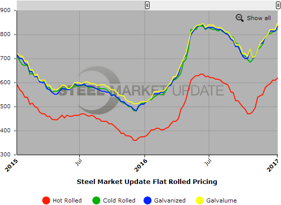 SMU Note: Below is a graphic showing our hot rolled, cold rolled, galvanized, and Galvalume price history. To use the graphs interactive capabilities, you must view it on our website here. If you need help navigating the website or need to know your login information, contact us at info@SteelMarketUpdate.com or by calling 800-432-3475.