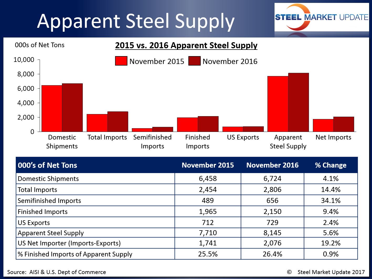 According to the latest data released from the U.S. Department of Commerce and the American Iron and Steel Institute, apparent steel supply for the month of November 2016 was 8,144,758 net tons. Apparent steel supply is calculated by adding domestic steel shipments and finished US steel imports, then subtracting total US steel exports.