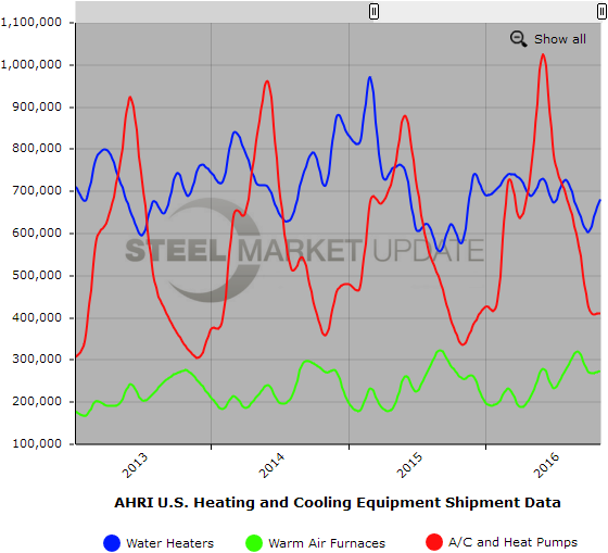 Below is a graph showing the history of water heater, warm air furnace, and air conditioner shipments. You will need to view the graph on our website to use it’s interactive features, you can do so by clicking here. If you need assistance with either logging in or navigating the website, please contact our office at 800-432-3475 or info@SteelMarketUpdate.com.
