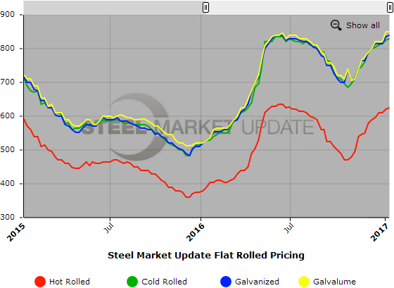 SMU Note: Below is a graphic showing our hot rolled, cold rolled, galvanized, and Galvalume price history. To use the graphs interactive capabilities, you must view it on our website here. If you need help navigating the website or need to know your login information, contact us at info@SteelMarketUpdate.com or by calling 800-432-3475.