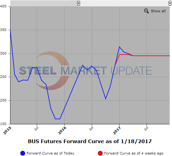 BUS futures have been easing along with HMS futures. Current selling interests in Q2’17 and 2H’17 have moved below $300/GT for the first time in a couple of weeks. Market will focus on the strength of offshore scrap shipments to gauge whether supply tightness returns to BUS. Current concern is that extra offshore bound scrap finds it way into Mid-west supply chain.