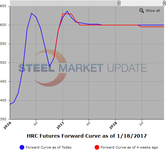 Friday was particularly active especially in the April/December 2017 HR future as it traded at $608/ST[$30.40/cwt] in 1,620 ST per month. Q2’17 HR was also very busy as it traded from $612/ST[$30.60/cwt] to $606/ST[$30.30/cwt]with slightly over 6,000 ST per month changing hands. March/May 2017 traded @ $615/ST[$30.75/cwt]. We had increased HR offer interest as the day progressed.
