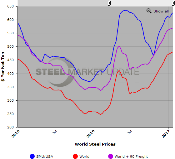 Below is a graph comparing SteelBenchmarker world HR export prices against the SMU domestic HR average price (we will build new data using Platts and replace the SteelBenchmarker data in the months ahead). We also have included a comparison with freight and traders’ costs added which gives you a better indication of the true price spread. You will need to view the graph on our website to use it’s interactive features, you can do so by clicking here. If you need assistance with either logging in or navigating the website, please contact us at 800-432-3475 or info@SteelMarketUpdate.com.