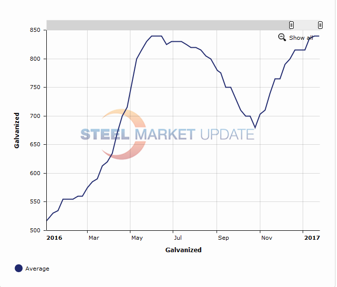 To that we need to add the revision of the zinc extras for galvanized due to the higher costs for zinc being traded on the LME exchange. There was a revision of the galvanized coating extras in November 2016 when zinc was trading at $1.10 per pound. Today, Kitco.com has the LME price at $1.24 per pound.