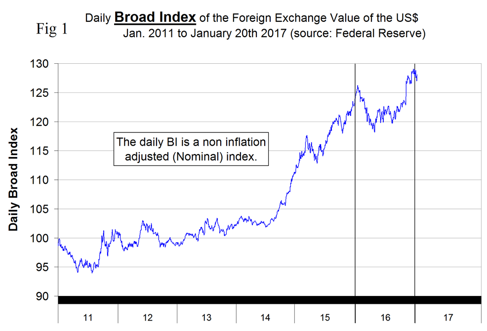 Please see the end of this report for an explanation of data sources. The Broad Index value of the US $ is reported several days in arrears by the Federal Reserve, the latest value published was dated January 20th (Figure 1).