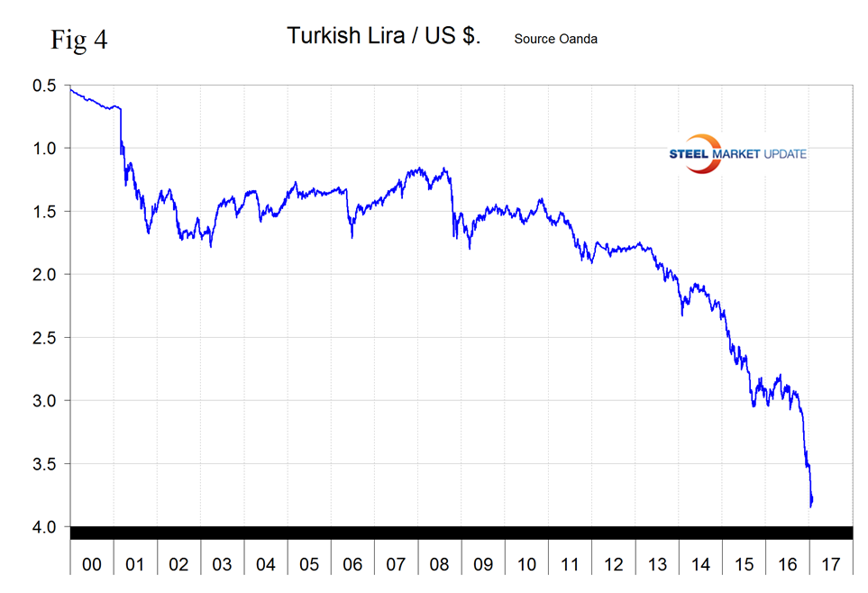 It reports the changes in one year, three months, one month and seven days for each currency and is color coded to indicate strengthening of the dollar in red and weakening in green. We regard strengthening of the US Dollar as negative and weakening as positive because the effect on net imports. An estimated 25 percent of the U.S. economy has some involvement in international trade therefore currency swings can have a large effect on the economy in general and of the steel industry in particular. Such a swing was evident in the GDP report published by the Bureau of Economic Analysis on Friday in which it was reported that net exports contributed negative 1.7 percent to GDP growth. The November 12th version of Table 1, immediately after the election and in anticipation of a near certain Fed rate increase, has the $ strengthening against 15 of the 16 currencies at the 7 day level and against 12 at the one month level.