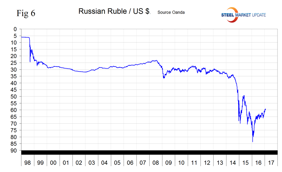 The Ruble bottomed out at 83.67/US $ on January 21st last year. Since then it has gained 32.1 percent to reach 59.223/US $ on January 26th this year (Figure 6).