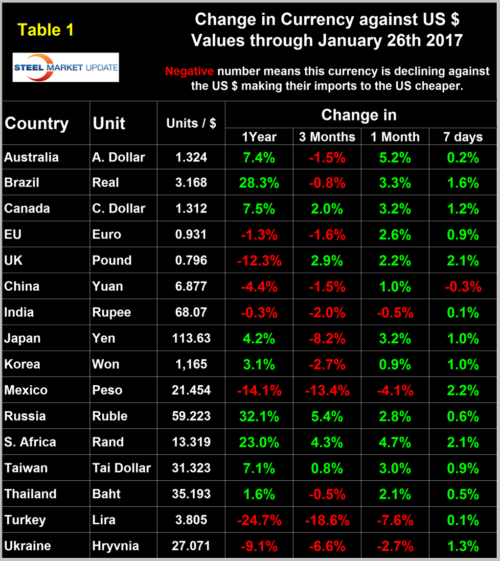 In each of these reports we comment on a few of the 16 steel trading currencies listed in Table 1. Charts for each of the 16 currencies are available through January 26th for any premium subscriber who requests them. We also include writings from experts who we regard as credible to explain some of the currency moves that we are witnessing.