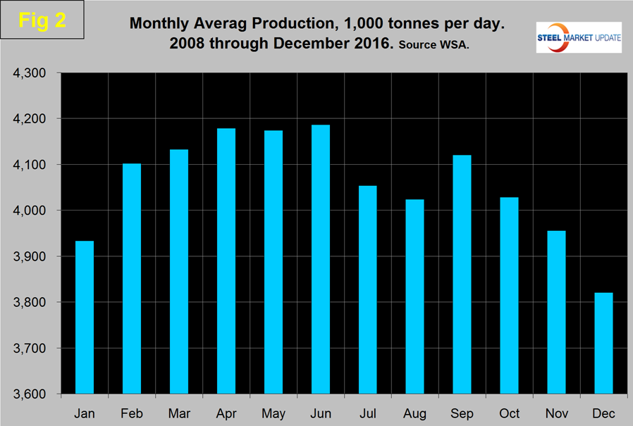 As we dig deeper into what is going on we start with seasonality. Global production has peaked in the summer for the last seven years including 2016. Figure 2 shows the average tons per day monthly production since 2008.