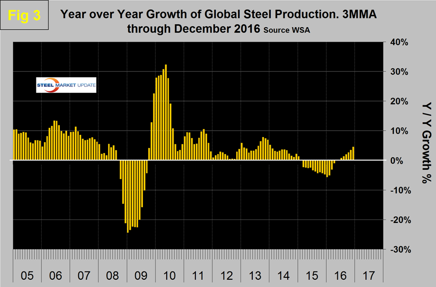 Global steel production in 2016 was up by 0.9 percent after declining by 3.4 percent in 2015. On a rolling 12 month basis, December was the first month to have positive growth since May 2015.