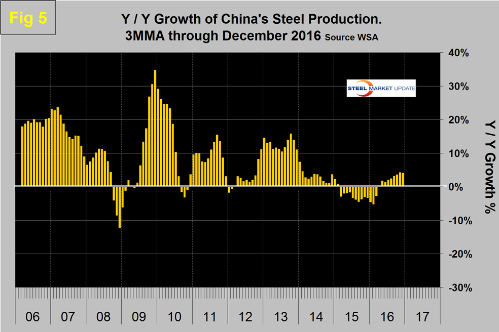 China’s production after slowing for 13 straight months on a 3MMA basis year over year returned to positive growth each month in May through November then declined slightly to 4.1 percent in December on a 3MMA year over year basis. The slowdown in Chinese steel production that the rest of the world has demanded is NOT happening and is in fact accelerating.