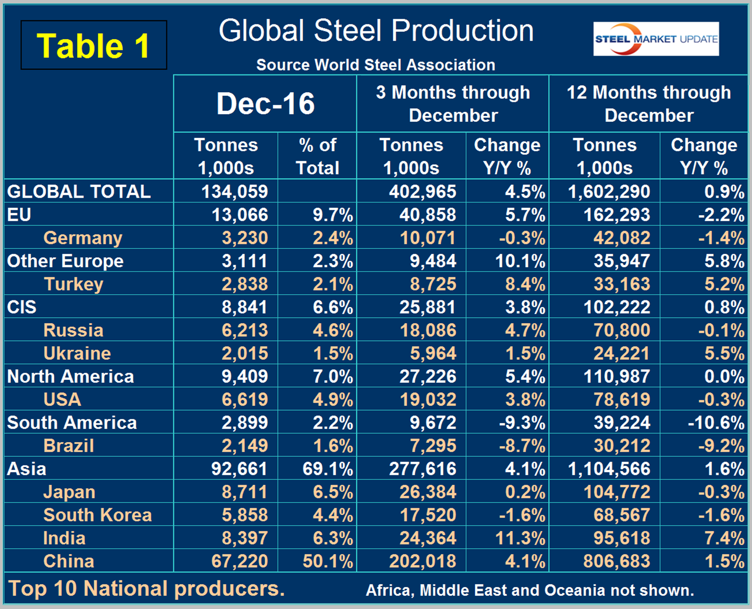 Table 1 shows global production broken down into regions and also the production of the top ten nations in the single month of December and their share of the global total. It also shows the latest three months and twelve months production through December with year over year growth rates for each period. Regions are shown in white font and individual nations in beige.