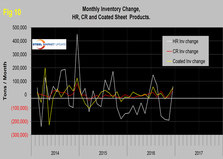Total inventory tonnage of sheet products has been in decline for over a year. Figure 10 shows the change in inventory monthly for the big 3 sheet products.