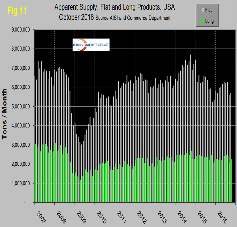 SMU Comment: In Figures 2, 4, 5 and 6, the white lines show t/d shipments. There was a decline in shipments for carbon steel products in total in 2015 but this year the decline has slowed. Figure 11 shows the total supply to the market of long and flat products based on AISI shipment and import data.