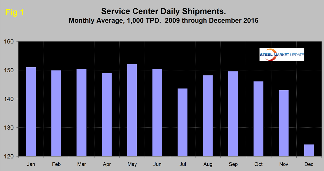 December service center daily shipments declined by 13.1 percent from November, a non event because since 2009 on average December has declined by 13.2 percent. Carbon steel shipments decreased by 369,100 tons, the number of shipping days was unchanged at 21, and tons per day (t/d) shipments decreased by 17,600 tons. Inventories at 6,754,200 tons were up by 176,000 tons.