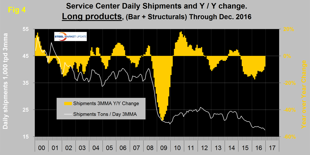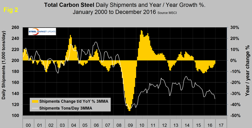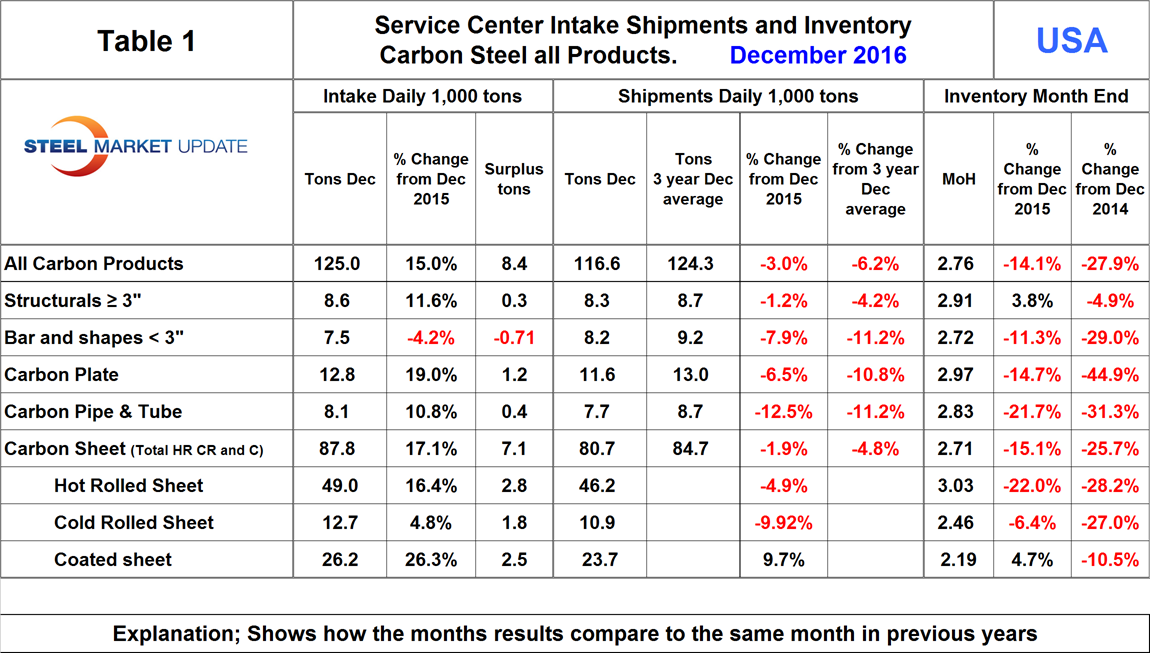 History tells us that we can expect January shipments to be up by over 27 percent. In the SMU analysis we always consider year over year changes to eliminate seasonality. Table 1 shows the performance by product in December compared to the same month last year and also with the average t/d shipments for this and the two previous months of December. We then calculate the percent change between December 2016 and December 2015 and with the 3 year December average. Our intention is to provide an undistorted view of market direction.