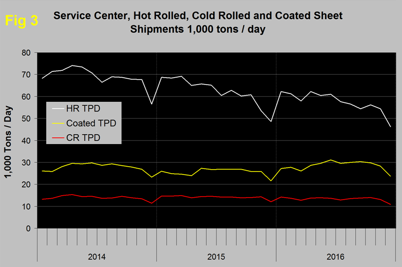 In our opinion the quickest way to size up the market is the brown bars in Figures 2, 4, 5 and 6 which show the y/y change in shipments. All four of these graphs show a y/y contraction though sheet is by far the best product group. Total daily shipments had a post recessionary high of 173,300 in June 2014 and as shown by the brown bars in Figure 2 have had 22 consecutive months of negative y/y growth. In December shipments of all products except coated sheet were down year over year. Sheet products in total were down by 1.9 percent. Figure 3 shows the shipment history since January 2014 of the three major sheet products.