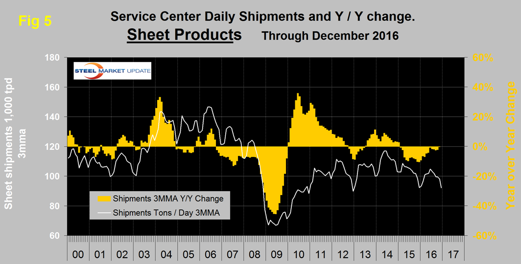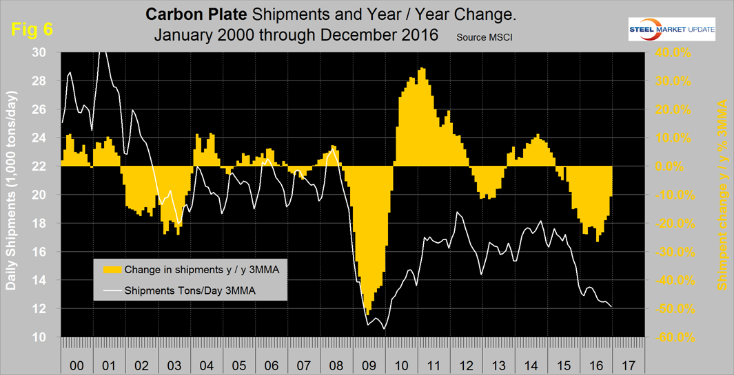 In previous reports we have combined sheet and plate as total flat rolled but these two categories have diverged so much in 2016 that it no longer makes sense to combine them. Sheet and plate products both had a good post-recession recovery. Both had some contraction in 2013 and growth in 2014 but since early 2015 they have diverged dramatically with plate performing much worse than sheet. In December y/y sheet was down by 1.9 and plate was down by 6.6 percent. Figures 5 and 6 show the 3MMA of t/d shipments and the y/y growth for each.