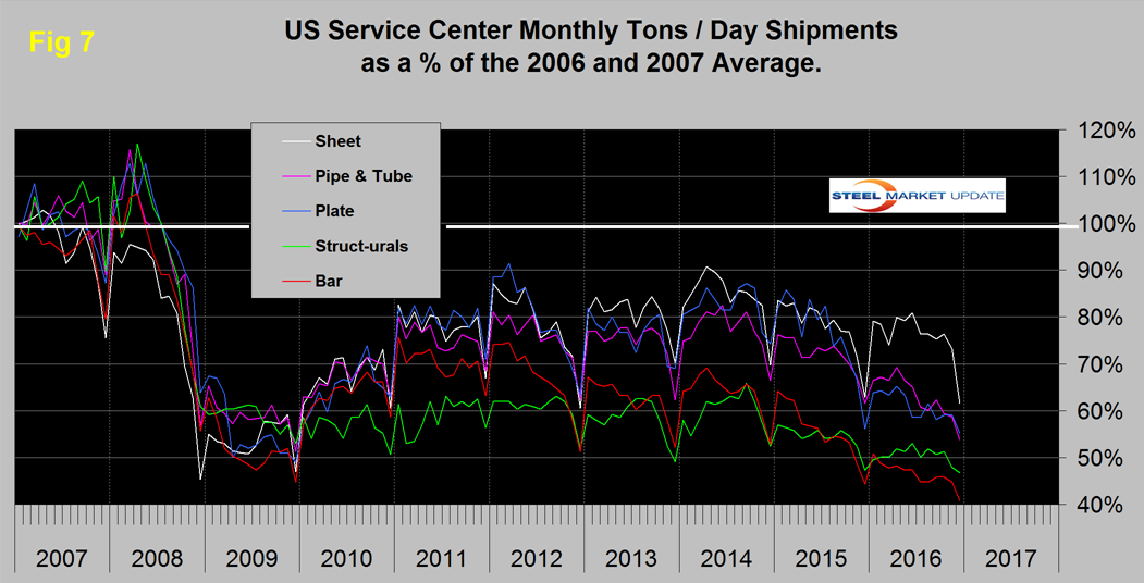 Each year all products experience the December collapse and January pick up. The total of carbon steel products is now at 54.9 percent of the shipping rate that existed in 2006 and 2007, with structurals and bar at 46.8 percent and 40.8 percent respectively. Sheet is at 61.7 percent, plate at 55.2 percent and tubulars at 53.8 percent.