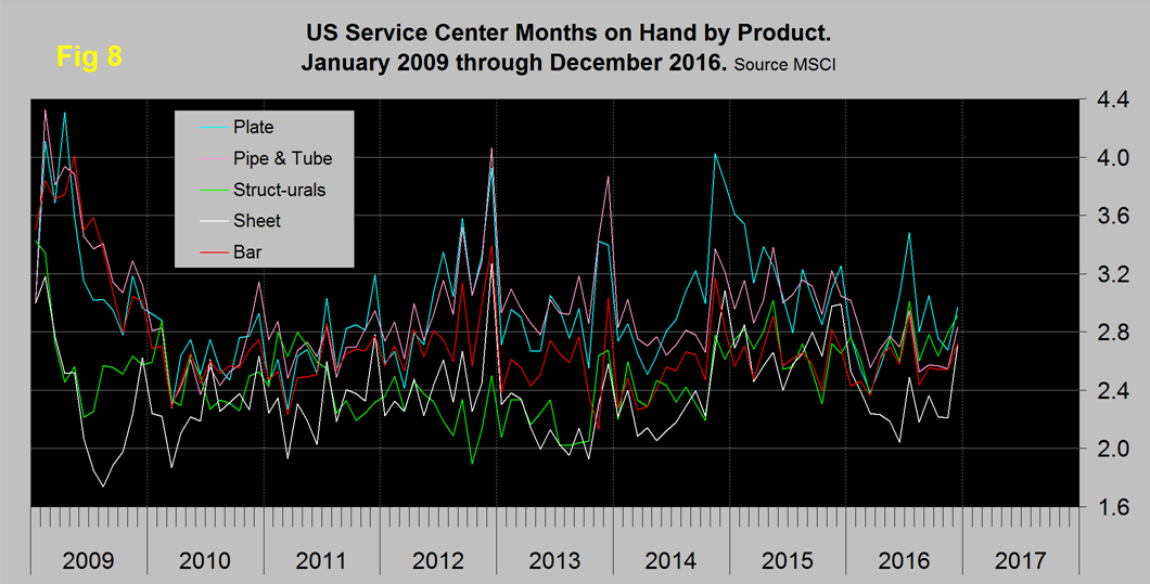 December closed with months on hand (MoH) of 2.76 for all carbon steel products, which was up from 2.33 at the end of both October and November. All products except structurals and coated sheet had a decrease in MoH year over year with tubulars down by 21.7 percent and HRC down by 22.0 percent. Figure 8 shows the MoH by product monthly since January 2009.