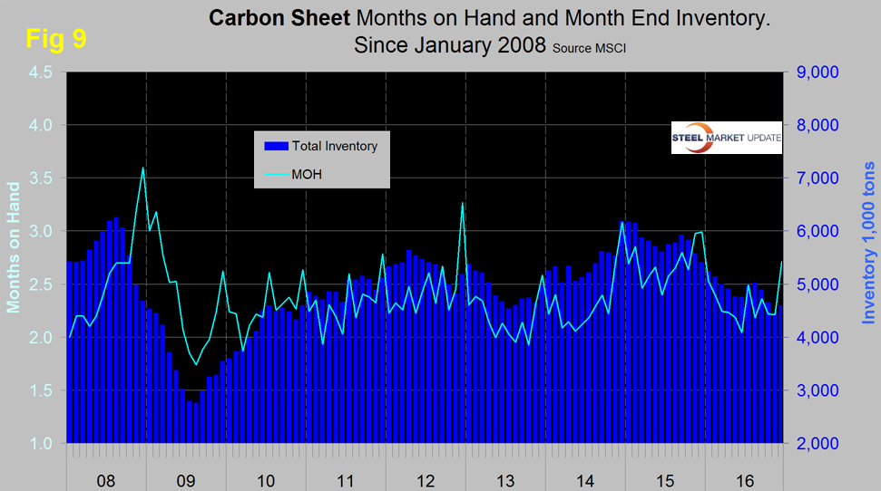 All products had a surge in months on hand in July driven not by an inventory volume increase but by a decrease in monthly shipments as a result of a small number of shipping days. Figure 9 shows both the month end inventory and months on hand since January 2008 for total sheet products.