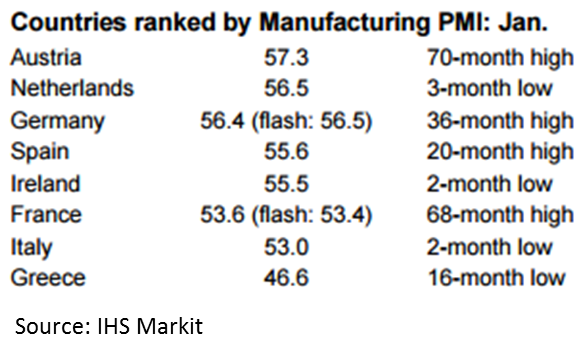 The PMI in the Eurozone rose to 55.2 in January form 54.9 in December for a 69-month high. New business and job creation was at one of the strongest rates since the first half of 2011, said IHS Markit.