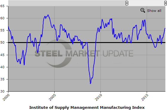 Below is a graph showing the history of the ISM Manufacturing Index. You will need to view the graph on our website to use its interactive features, you can do so by clicking here. If you need assistance logging into or navigating the website, please contact our office at 800-432-3475 or info@SteelMarketUpdate.com.