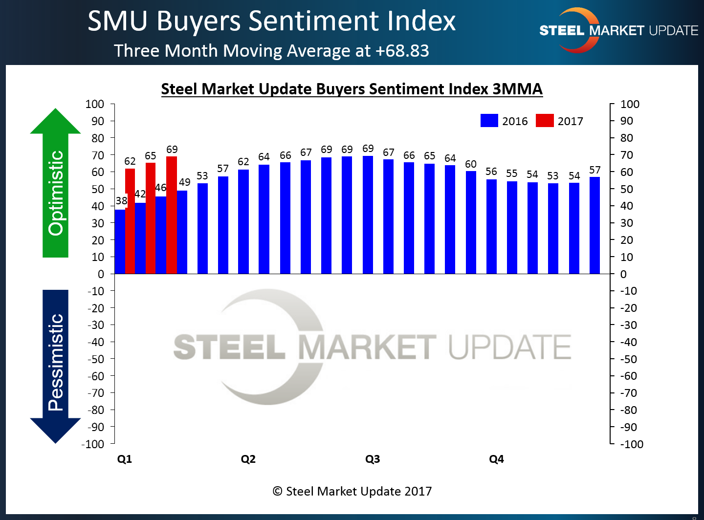 Buyers and sellers of flat rolled steel are feeling good about the industry based on the results of the just completed flat rolled steel market trends analysis released by Steel Market Update (SMU). The SMU Steel Buyers Sentiment Index set another record high beating the high mark achieved just two weeks ago (an explanation of our Index is at the end of this article).