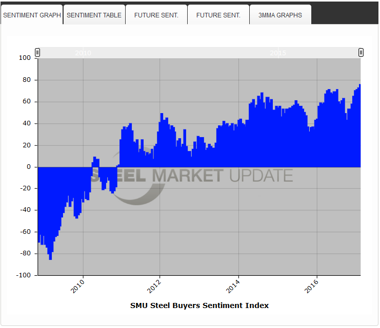 SMU Current Sentiment Index is +76, up +3 points from mid-January and a new high for a single data point since Steel Market Update began indexing Sentiment in 2008.