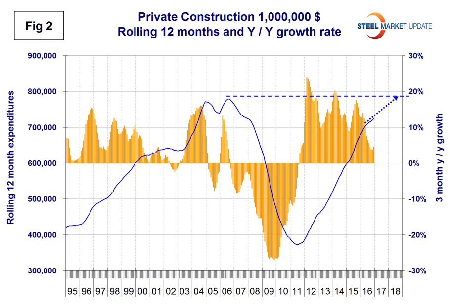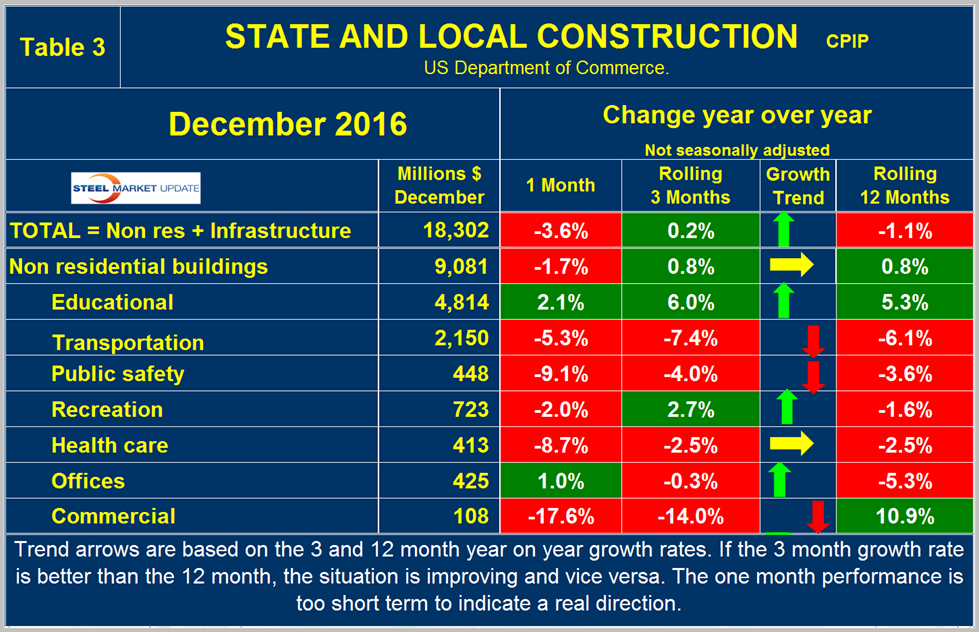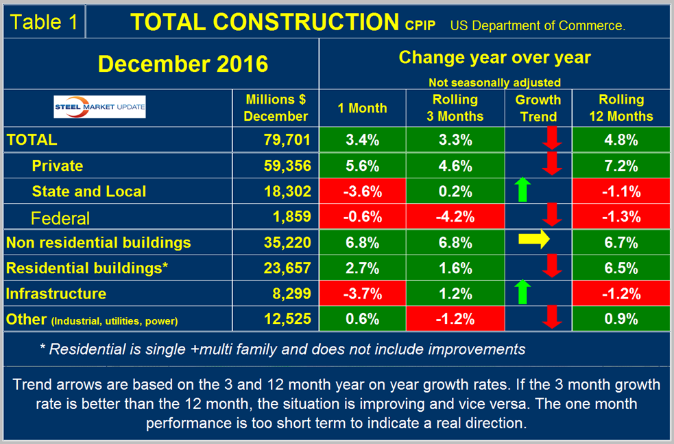 The official CPIP press release gives no appreciation of trends on a historical basis and merely compares the current month with the previous one on a seasonally adjusted basis. The data is provided as both seasonally adjusted and non-adjusted. The detail is hidden in the published tables which we at SMU track and dissect to provide a long term perspective. Our intent is to provide a rout map for those subscribers who are dependent on this industry to “Follow the money.” This is a very broad and complex subject therefore to make this monthly write up more comprehensible we are keeping the information format as consistent as possible. In our opinion the absolute value of the dollar expenditures presented are of little interest. What we are after is the magnitude of growth or contraction of the various sectors. In the SMU analysis we consider only the non-seasonally adjusted data. We eliminate seasonal effects by comparing rolling three month expenditures year over year. CPIP data also includes the category of residential improvements which we have removed from our analysis in the rational that such expenditures are minor consumers of steel.