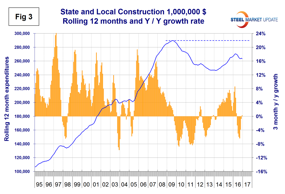 This was the first month of positive growth after six consecutive month of contraction. Figure 3 shows year over year growth as the brown bars and the rolling 12 month total of expenditures as the blue line.