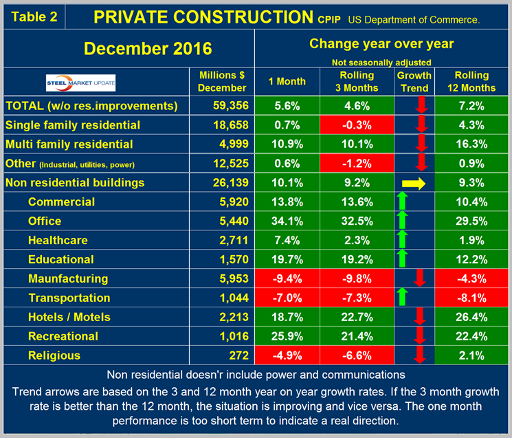 Single family residential is dominant and in the 12 months of 2016 totaled $243 billion, up from $233 billion in 2015. Manufacturing, transportation and public safety contracted in 2016 y/y, all other sectors expanded led by lodging (hotels and motels) which was up by 26.4 percent, offices up by 25.7 percent and multi-family residential buildings up 15.4 percent.
