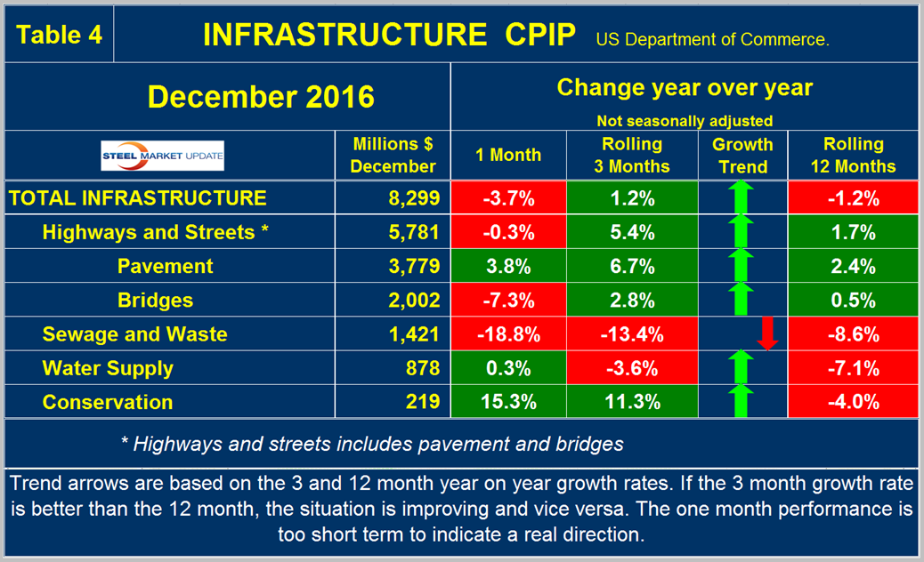 Expenditures contracted for five straight months through October before returning to positive growth in November and December when growth was positive 0.5 percent and 1.2 percent respectively. Prior to June there was a string of 34 out of 35 months with positive growth. Highway and streets including pavement and bridges returned to positive growth of 4.4 percent in three months through November and 5.4 percent through December after five straight months of contraction. These account for about 2/3 of total infrastructure expenditures. All infrastructure segments except sewage and waste and water supply had positive growth in three months through December y/y which was a startling turnaround from our October report. Highway pavement is the main subcomponent of highways and streets and had a 6.7 percent positive growth in three months through December. Bridge work had negative growth of 4.9 percent in October but rebounded to positive 2.7 percent in November and 2.8 percent in December (Table 4).