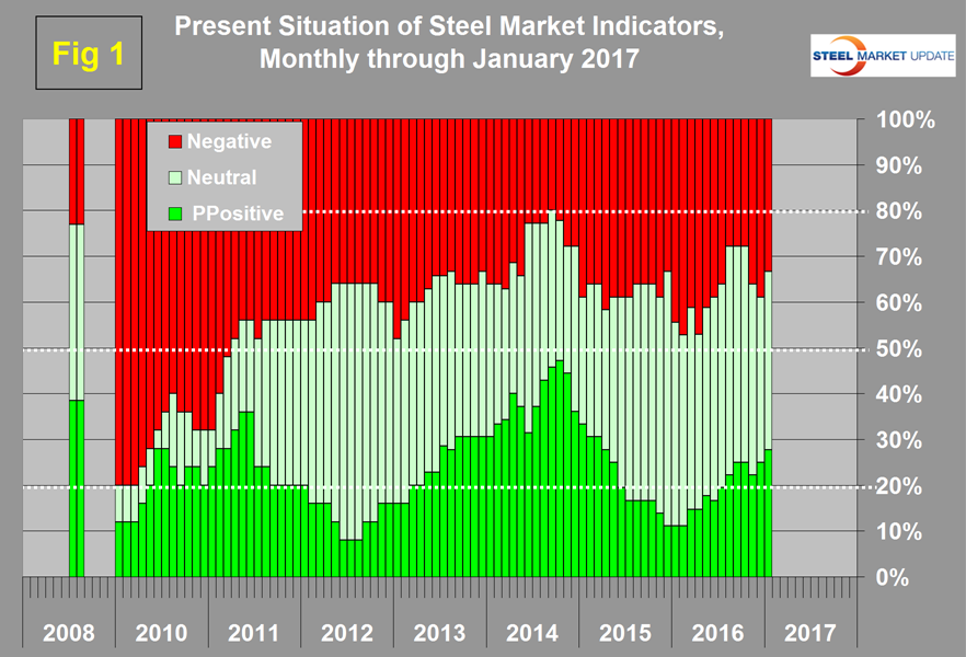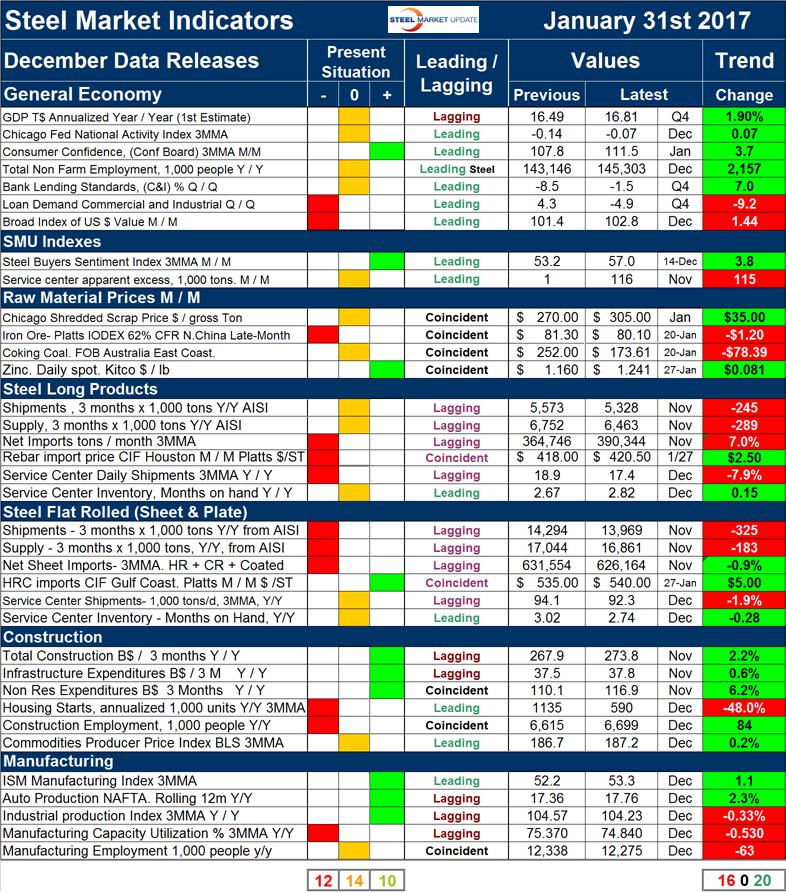 There was a decrease of two negative and an increase of one neutral and one positive indicator since we last published on December 29th. Our intent in using the word neutral is to say that this indicator is considered to be in the mid-range of historical data. We currently regard 10 of the 36 indicators to be positive, 14 to be neutral and 12 to be negative on a historical basis. An overall view of the color codes in the present situation columns show that in every section the present situation is mixed suggesting a market that is looking for direction. Changes that occurred in the last month were as follows. The price of Chicago shredded continued to improve raising it into the neutral category. After rising dramatically in the period July through November last year, the price of coking coal took a dive in December and January falling from $310 on November 18th to $174 on January 20th. This put the price of coking coal back into the neutral zone. The price of HRC imports to the Gulf reached $540/short ton on January 27th and was re-classified as positive. Service center flat rolled months on hand increased in December and this data point was downgraded to neutral. Based on data from the Commerce Department, total construction, infrastructure and non-residential expenditures for November were upgraded from neutral to positive.