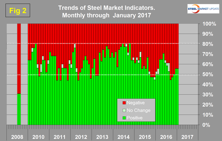 Most values in the trends columns are three month moving averages to smooth out what can be very erratic monthly data. The proportion of indicators trending positive through January 30th was 55.6 percent with 44.4 percent trending negative and zero indicators unchanged. This was no net change from our last update on December 29th. In October 2014 the proportion trending positive was 80.6 percent which coincided with the highest month of total steel supply since the recession. There was a steady deterioration through 2015. At the end of 2015 the proportion trending positive fell below 50 percent for the first time since March and April 2013. Between January 2015 and May of last year there was a surge in positives from 44.4 percent to 70.6. There was a negative turnaround between May and September when the proportion of indicators trending positive returned to 44.4 percent. In the fourth quarter the positive trends improved to 55.6 percent where it remained unchanged in January. Figure 2 shows the trend of the trends and the pre-recession situation at the far left of the chart. In August 2008 over 2/3 (69.2 percent) of our indicators were trending negative and the steel market crashed in September of that year.