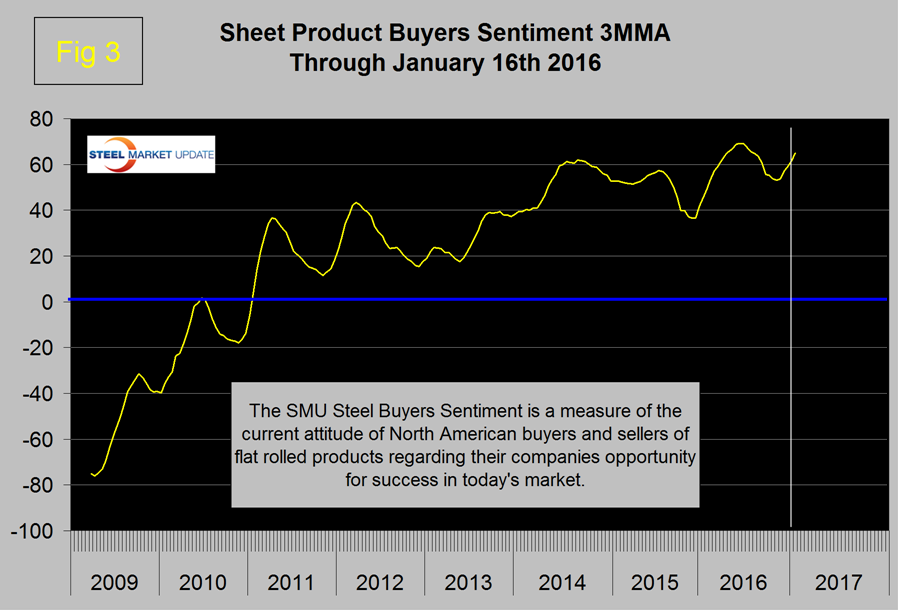 The general economy with the exception of commercial and industrial loan demand and the value of the US $ is trending positive. In the SMU index section, steel buyers sentiment continued to improve (Figure 3) but there was a minor reversal in service center excess which increased to 116,000 tons.