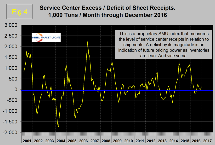 In the raw materials section the price of iron ore declined slightly and the price of zinc made up most of the decline that occurred in December. We regard rising raw materials prices as positive and indicative of a strengthening market. In the long products section the only trend reversal was that net imports increased. In the flat rolled section, net imports did a reversal and declined. There were no other trend changes for flat rolled or long product sectors. In the construction sector the only change was that infrastructure expenditures reversed course and expanded. It may be that the $305 billion authorization approved by congress in December 2015 is starting to kick in. There were no trend changes in the manufacturing sector.
