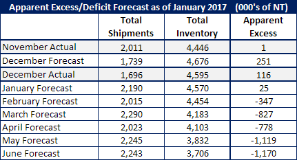 November shipments totaled 2,011,000 tons, inventories of flat rolled were 4,446,000 tons (MSCI numbers) and the Apparent Excess as of the end of November 2016 was 1,000 tons. Service centers were, according to the SMU model, in a balanced inventory status.