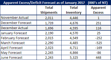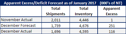 Our forecast for December was for the Apparent Excess of carbon flat rolled inventories would expand from 1,000 tons to 251,000 tons. Inventories did expand but only to 116,000 tons.