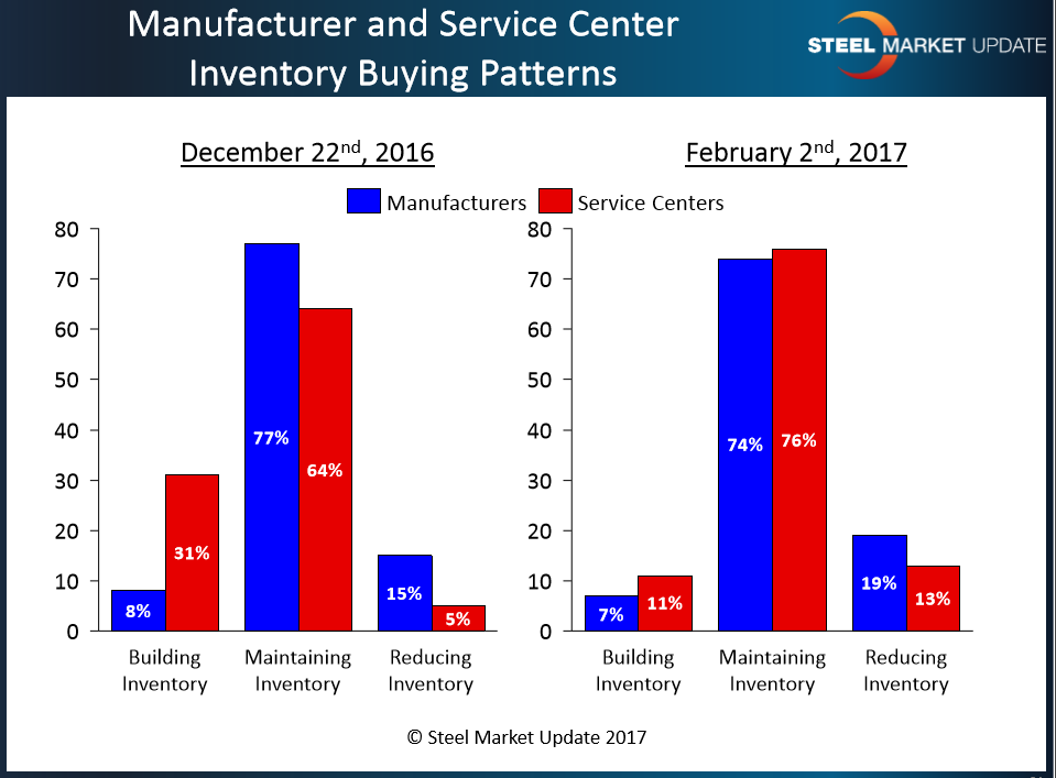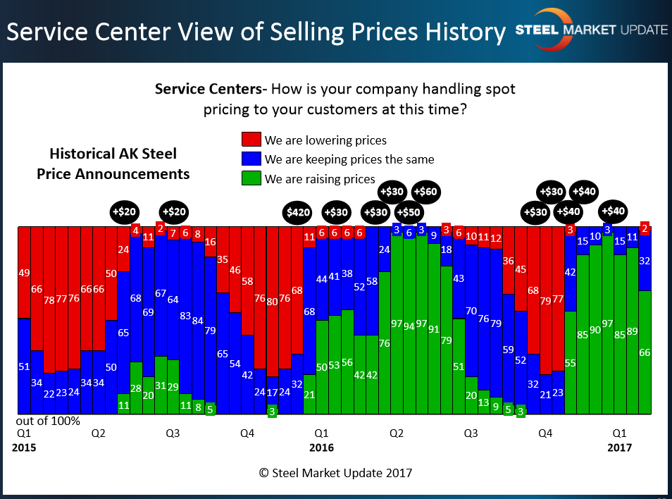 Based on our most recent flat rolled market trends analysis (survey), we are now looking at a market that appears to be balanced with most service centers continuing to support higher prices, as 66 percent of our service centers are reporting raising spot prices. But, the first crack has formed, with 2 percent reporting they are lowering prices.