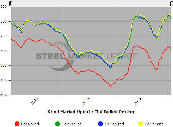SMU Note: Below is a graphic showing our hot rolled, cold rolled, galvanized, and Galvalume price history. To use the graphs interactive capabilities, you must view it on our website here. If you need help navigating the website or need to know your login information, contact us at info@SteelMarketUpdate.com or by calling 800-432-3475.