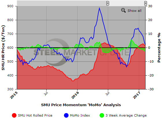 The graph below demonstrates the relationship between the SMU hot rolled coil price, the SMU Price MoMo Index, and the three week moving average change in the MoMo Index. Click here to view and interact with it on our website. As published in our Tuesday evening newsletter and revised in our Thursday issue, the latest SMU HRC price range is $590-$630 per ton with an average price of $610, down $10 over the previous week.