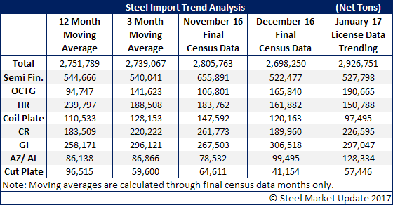 The U.S. Department of Commerce released the Final Census Data for foreign steel imports for the month of December 2016. We now have the 12-month moving average (12MMA) for calendar year 2016 as well as the 3-month moving average for the last 3 months (4Q) 2016. The January numbers are based on license data which can vary from the final numbers so we refer to it as “trending.”