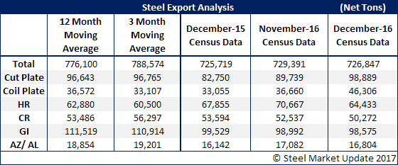 December steel exports totaled 726,847 net tons (659,385 metric tons), down 0.3 percent over November but up 0.2 percent from December 2015. This is the lowest export level seen since December 2015 when 658,362 tons were exported. Total December figures are below the thee month moving average (average of October, November, and December 2016 figures) and below the twelve month moving average (average of January 2016 through December 2016 data). Here is a breakdown of flat rolled and plate exports: