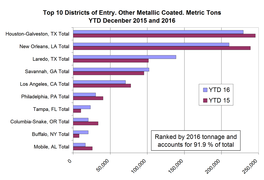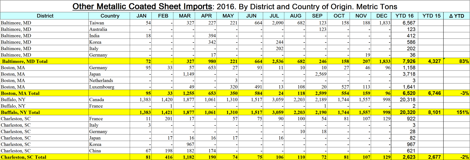 The table included here (click to enlarge) is a small extract from the data sheet for other metallic coated coil which is mainly Galvalume. It describes the tonnage that has come in through Baltimore, Boston, Buffalo and Charleston. It shows where it came from, the YTD tonnage and the YTD change compared to 2015. The grand total volume of OMC through December was down by 2.0 percent but Baltimore and Buffalo had a large increase in tonnage.