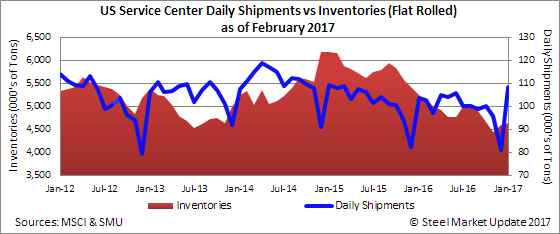 The Metal Service Center Institute (MSCI) released shipment and inventories data for the steel service centers located in the United States. They reported higher shipment rates coupled with lower flat rolled inventories (higher overall for all products) which is very supportive for prices to tighten over the next 30 days.