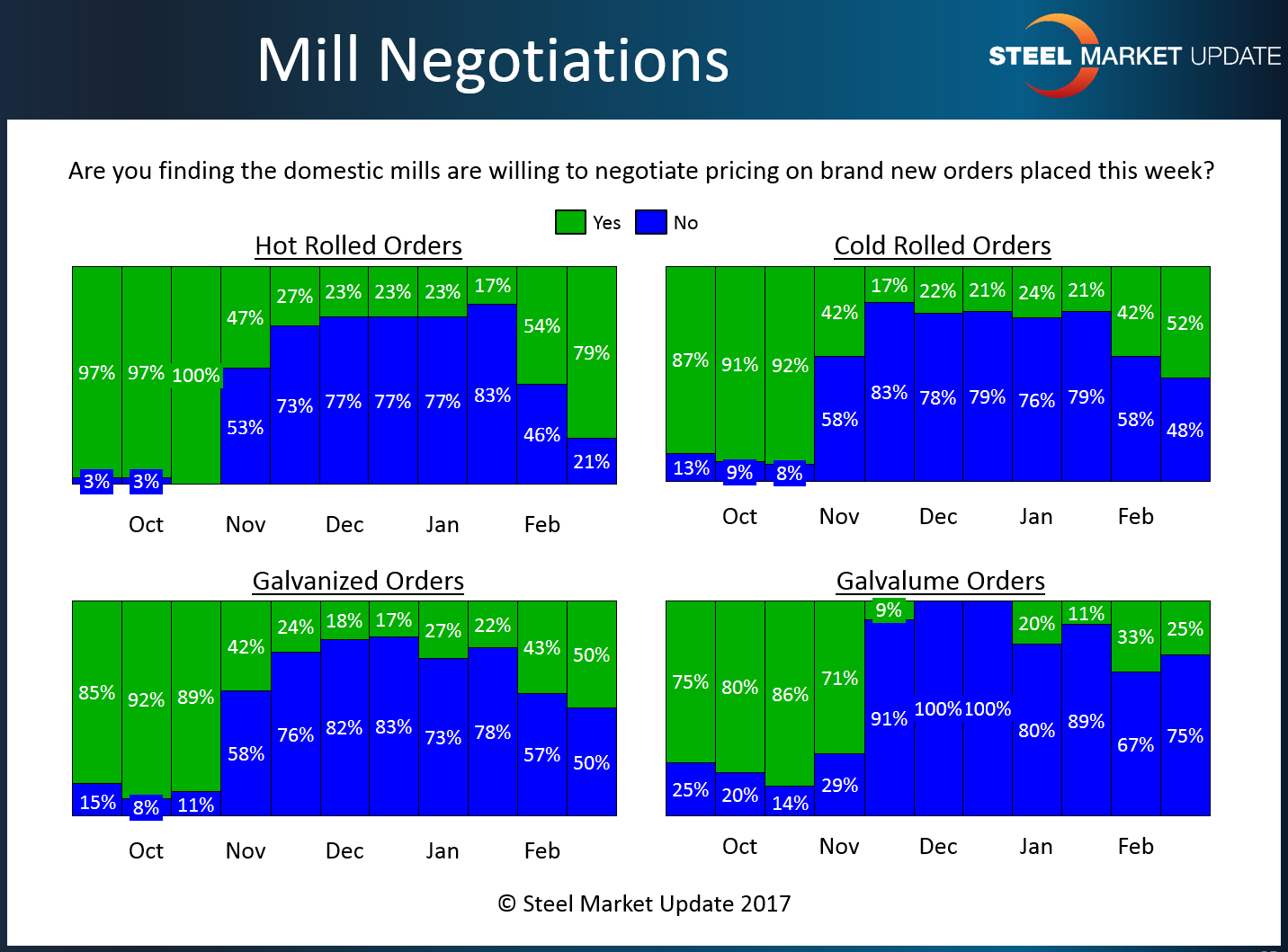 Seventy-nine percent of the respondents reported steel mills as willing to negotiate hot rolled spot pricing. We need to go back to our mid-October 2016 analysis in order to find a percentage exceeding 50 percent.